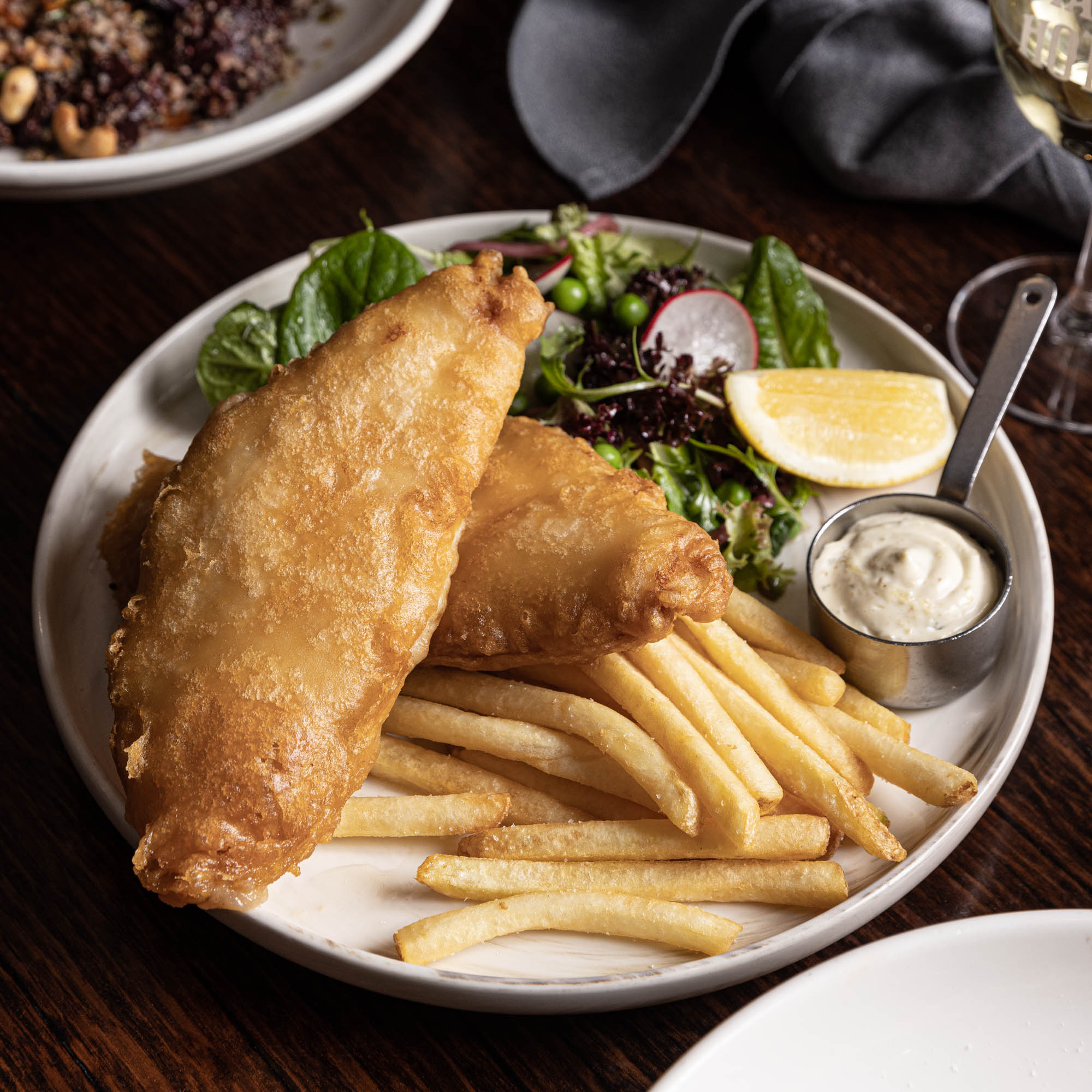 Beer Battered Barra And Potato Scallops With Minted Pea Mayo